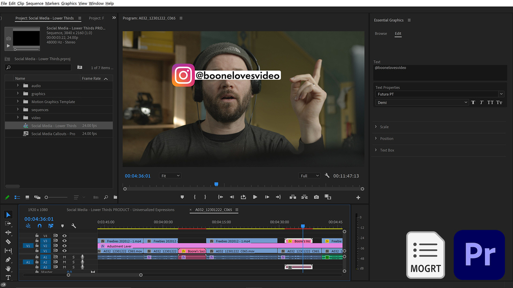 Customizable MOGRT (motion graphics template) for Adobe Premiere Pro.